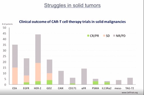 2017年以來,美國食品藥品監(jiān)督管理局接連批準諾華公司的Kymriah 和 Kite 制 藥 的 Yescarta上市,使CAR-T 療法開始出現(xiàn)在大眾視野,并逐漸成為最具前景的腫瘤治療方式之一。近年 CAR-T在血液系統(tǒng)腫瘤治療,尤其是靶向CD19 CAR-T在急性難治型淋巴細胞白血病治療中,取得了矚目成就。然而,CAR-T在實體瘤的攻堅上仍處于一個初期階段。按照雷博士的話說,為數(shù)不多的靶點,腫瘤微環(huán)境、腫瘤異質(zhì)性、On Target Off-tumor所導致的副作用都是限制CAR-T療法在實體瘤領(lǐng)域發(fā)揮的重要因素。