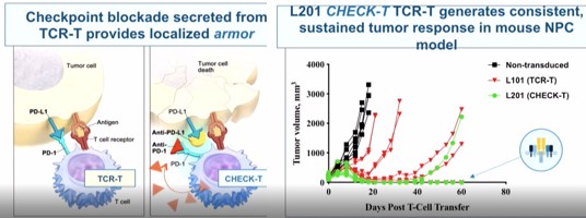 據(jù)悉,在去年十一月份,天科雅的TC-E202獲批臨床。該項目是全球首款加載抗PD-1抗體的HPV TCR-T細胞療法臨床實驗。雷博士在會后采訪時表示;“這款產(chǎn)品的差異化在于我們在T細胞上加載TCR的同時也賦予了他產(chǎn)生PD-1的能力,我們利用這套技術(shù)同時做靶點的攻擊也解決微環(huán)境的問題。”