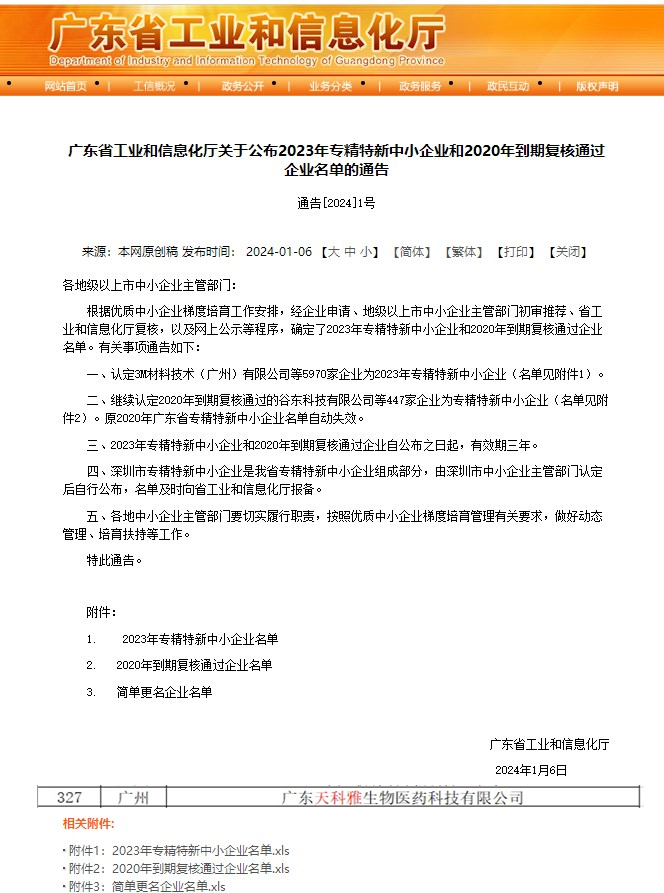 2024年1月6日,廣東省工業(yè)和信息化廳公示2023年專(zhuān)精特新中小企業(yè)名單,經(jīng)過(guò)市區(qū)推薦,合規(guī)審查,專(zhuān)家評(píng)審等,天科雅榜上有名,喜獲廣東省“專(zhuān)精特新”中小企業(yè)認(rèn)定。