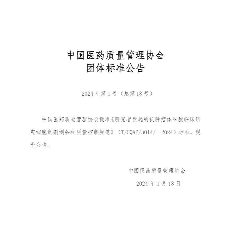 2024年5月1日,由中國(guó)醫(yī)藥質(zhì)量管理協(xié)會(huì)發(fā)布的《研究者發(fā)起的抗腫瘤體細(xì)胞臨床研究細(xì)胞制劑制備和質(zhì)量控制規(guī)范》(T/CQAP 3014—2024)標(biāo)準(zhǔn)(以下簡(jiǎn)稱(chēng)“標(biāo)準(zhǔn)”)將正式實(shí)施。