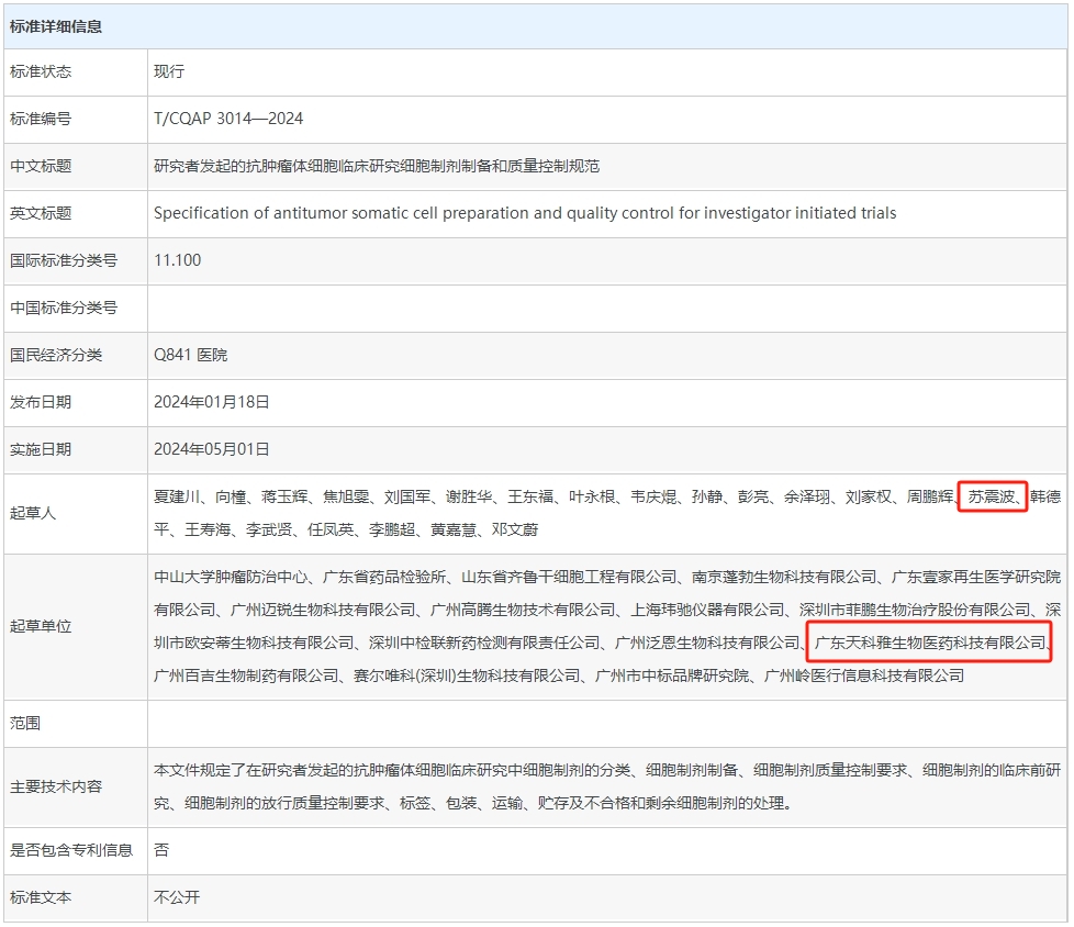 天科雅參與制定《研究者發(fā)起的抗腫瘤體細(xì)胞臨床研究細(xì)胞制劑制備和質(zhì)量控制規(guī)范》團(tuán)體標(biāo)準(zhǔn)