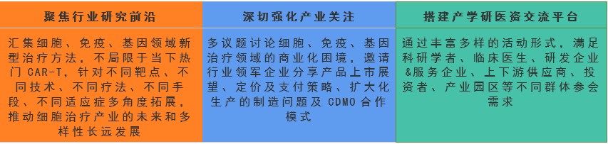本屆大會誠邀國內外領先學術科研機構、大型醫(yī)院、產業(yè)鏈上下游企業(yè)、國家監(jiān)管機構、產業(yè)園區(qū)、投資機構、行業(yè)協(xié)會等專業(yè)人士共聚上海,分享行業(yè)進展動態(tài),探討產業(yè)發(fā)展瓶頸及細胞治療和基因治療的未來之路!